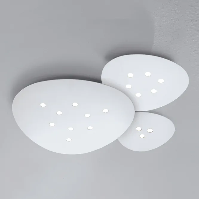 Lampada a soffitto dalla forma tondeggiante con corpo/diffusore in alluminio 2 mm di spessore dove alloggiano luci a LED 220V che non necessitano di alimentatore.